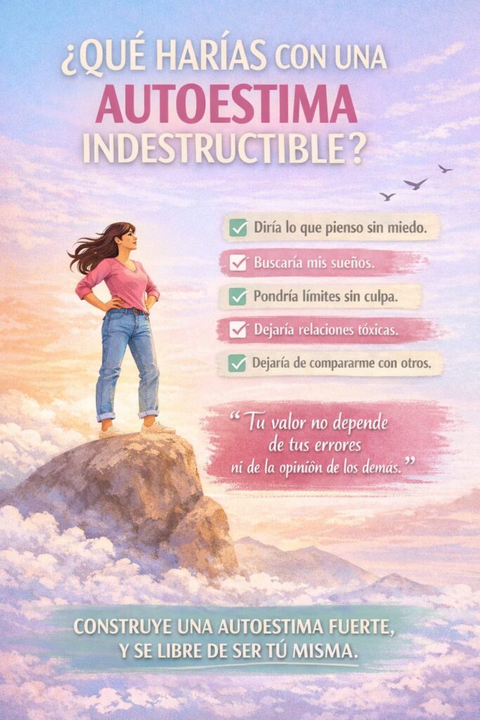 Imagina por un momento que tu autoestima fuera indestructible. No es una autoestima frágil que depende de la aprobación de los demás. No es una autoestima que se derrumba cuando alguien te critica o te rechaza o te ignora. Sino es una autoestima firme, profunda , que nadie puede destruir. Entonces pregúntate: ¿Qué haría yo diferente en mi vida con una autoestima inquebrantable? Tal vez harías lo siguiente: